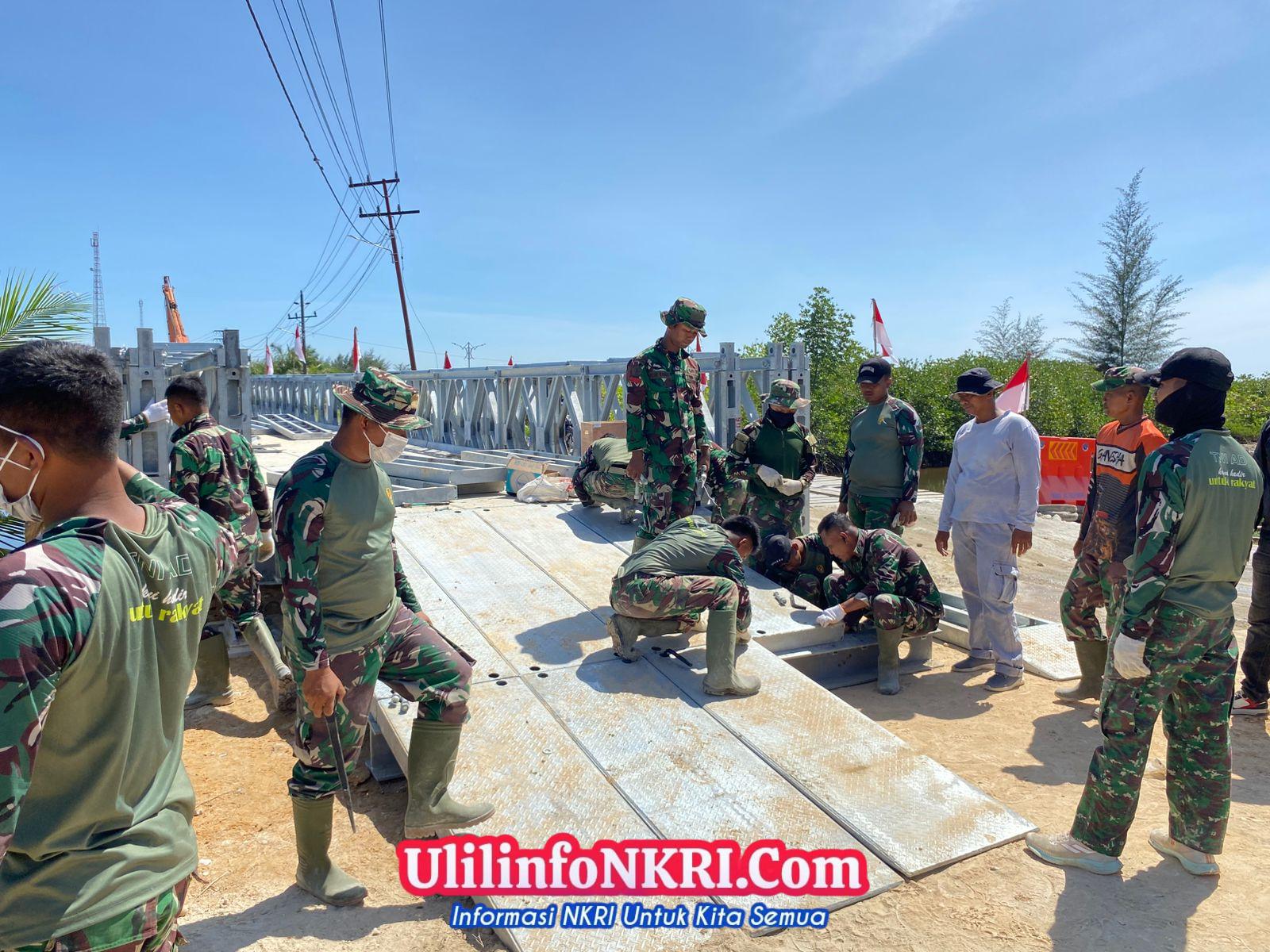 Di Aceh Utara, pembangunan Jembatan Wisata Laut Bangka juga terus berjalan. Personel Babinsa bersama TNI lainnya merangkai besi baja rangka jembatan di depan rumah warga. Mengenakan sarung tangan dan topi pengaman, para prajurit terlihat ceria dan ikhlas membantu pemulihan akses tersebut.