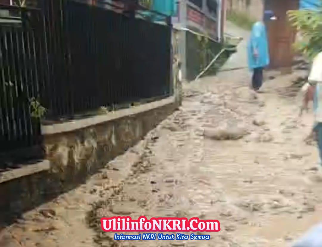 Material longsoran dari kawasan perumahan yang berada di dataran lebih tinggi mengalir tanpa kendali, menghantam bangunan semi permanen dan menimbun fasilitas milik warga.