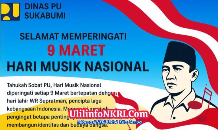 UlilInfoNkri.Com, Sukabumi – Dinas Pekerjaan Umum (PU) Sukabumi turut menyampaikan ucapan selamat memperingati Hari Musik Nasional yang jatuh setiap tanggal 9 Maret. Peringatan ini bertepatan dengan hari lahir Wage Rudolf Supratman (WR Supratman), pencipta lagu kebangsaan Indonesia Raya yang menjadi simbol persatuan dan semangat bangsa.