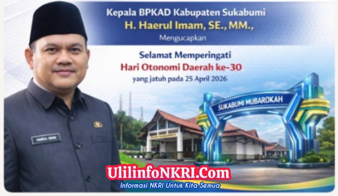 Ulilinfonkri.com – Sukabumi – Sukabumi – Kepala Badan Pengelolaan Keuangan dan Aset Daerah (BPKAD) Kabupaten Sukabumi, H. Haerul Imam, SE., MM., menyampaikan ucapan selamat sekaligus refleksi dalam rangka memperingati Hari Otonomi Daerah ke-30 yang jatuh pada 25 April 2026. Momentum ini disebut sebagai tonggak penting dalam perjalanan demokrasi dan pembangunan daerah.